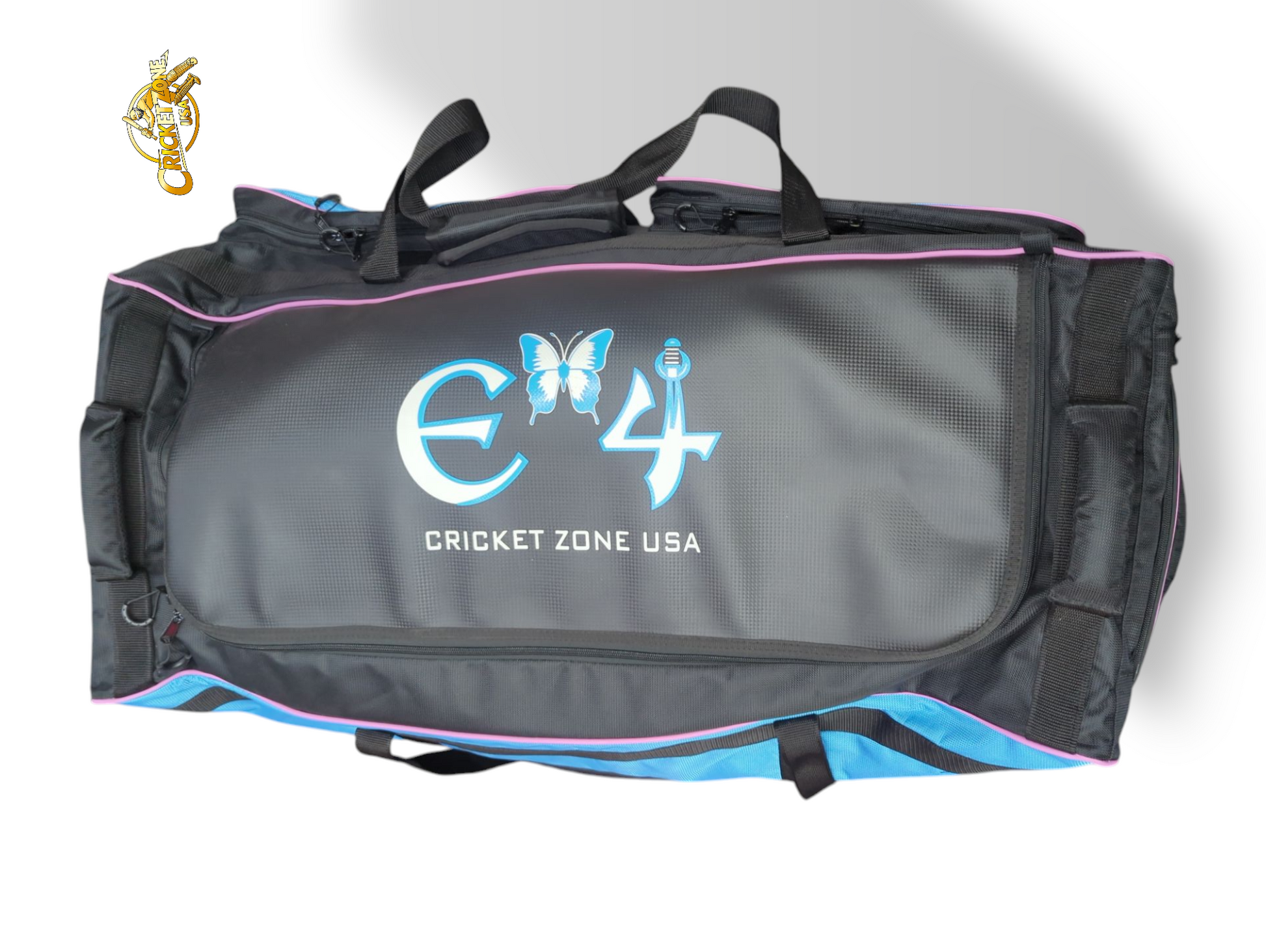 E4 Pro Series Cricket Bag – Black with Sky Blue Branding (2025)